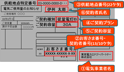 お申込みには、検針票、または契約書に記載されている下記①~⑤の情報が必要です。 必ずお手元に検針票または契約書をご用意ください。 お手元にない場合は、下記の①~⑤について現在ご契約の電力会社へお問い合わせ下さい。